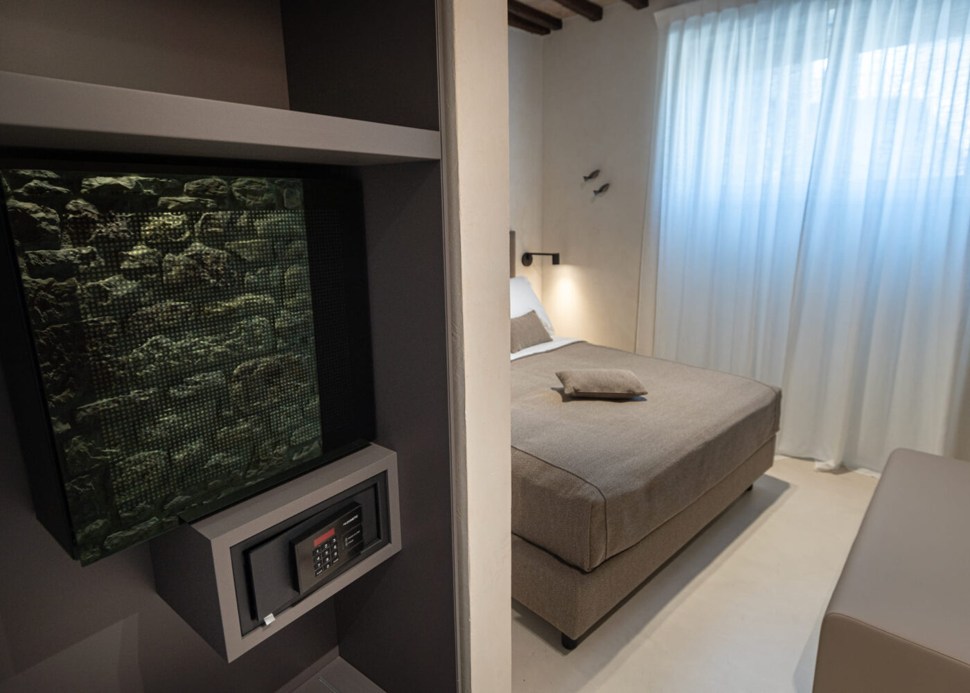 Dalla camera da letto è possibile accedere al terrazzo privato con arredamento da esterni, spazio perfetto per le serate estive. La climatizzazione è autonoma e controllabile attraverso un termostato a parete.